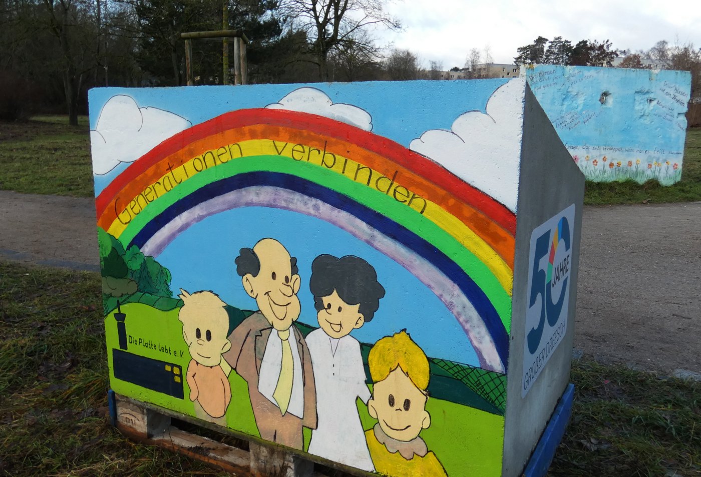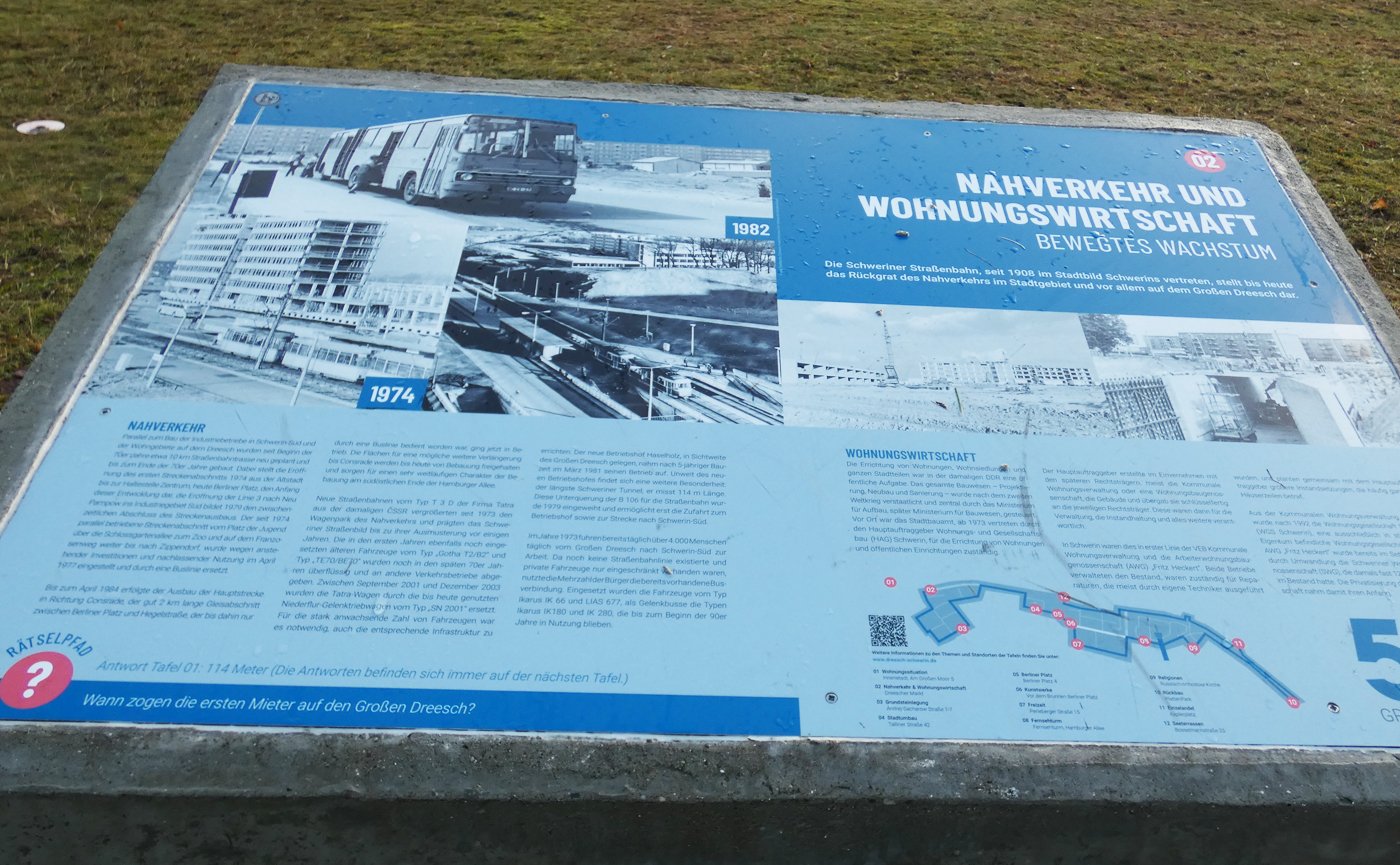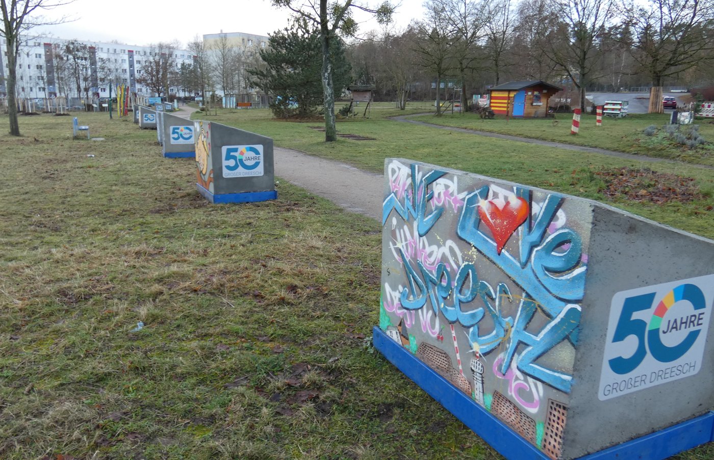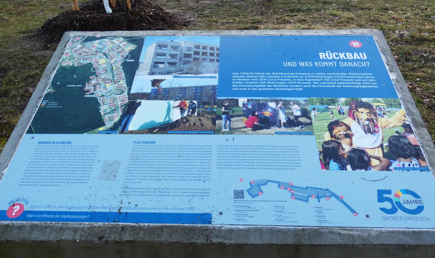 Es wurden Obstbäume gepflanzt. Die Gehwege werden erneuert, und die Betonelemente vom Ausstellungspfad "50 Jahre Großer Dreesch" haben im PlattenPark ihren endgültigen Platz bekommen. Man kann sich also über die Geschichte des Plattenbaugebietes ganz bequem bei einem Spaziergang informieren und sich die schönen Bilder, die von verschiedenen Vereinen gemalt wurden, ansehen