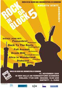 Am 15. November geht es in der Halle am Fernsehturm wieder hoch her - beim 5. Jugendrockfestival „Rock in da Block“. Die Organisatoren, zu denen der Schweriner Jugendring und der Verein „Die Platte lebt“ gehören, bringen diesmal sechs Bands auf die Bühne: Die Gruppen „Pausenbrot“ und „Full Assault“ aus Schwerin, „Stakeout“ aus Berlin, „Alice in Wonderland“ aus Parchim, „Back To The Roots“ aus Ludwigslust und „Drank Milk“ aus Neustadt Glewe. Die Idee des Festivals, das wieder unter dem Motto „kreativ statt aggressiv“ steht, ist es, mit der Musik für Toleranz und ein multikulturelles Leben zu werben. Mit dem Konzertangebot für junge Menschen soll die örtliche Musikszene gefördert und die Initiative für Toleranz und Respekt gegenüber verschiedenen Kulturen, gegen Ausländerfeindlichkeit und Antisemitismus unterstützt werden. Dabei ist es den Organisatoren sehr wichtig, dass die Jugendlichen den größten Teil selbst vorbereiten, ihre Kreativität spielen lassen, um am Ende ihre eigene bunte Veranstaltung durchzuführen. Auch in diesem Jahr wird es wieder ein Rahmenprogramm geben, das allerdings noch geheim gehalten wird. Kommt alle am 15. November in die Halle am Fernsehturm und last Euch überraschen! Beginn ist um 18 Uhr, Einlass ab 17 Uhr. Unsere jugendlichen Organisatoren haben keine Mühe gescheut, um ein buntes Programm auf die Beine zu stellen. „Rock in da Block“ ist ein Projekt, in dem Jugendliche in vielen Richtungen kreativ tätig werden können, ob im Veranstaltungsmanagement, beim Aufbau der Ton- und Lichttechnik, bei der Gestaltung des Rahmenprogramms und der Räumlichkeiten oder bei der Auswahl der Musikgruppen. Sie können stolz sein, was sie in den fünf Jahren für das Projekt „Rock in da Block“ geschaffen haben. Dass das Jugendrockfestival auch in diesem Jahr durchgeführt werden kann, verdanken wir ganz besonders der Deutschen Bank und dem Verfügungsfonds „Sozial Stadt“, denn nur durch diese Mittel haben wir die Finanzierung realisieren können. Wir hoffen auf eine ähnlich gute Resonanz wie in den vergangenen Jahren. Steffen MammitzschSteine und Papier - Sauber ist cool