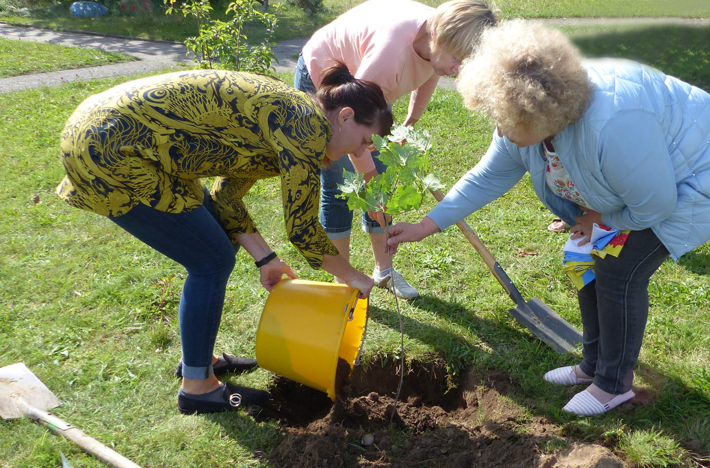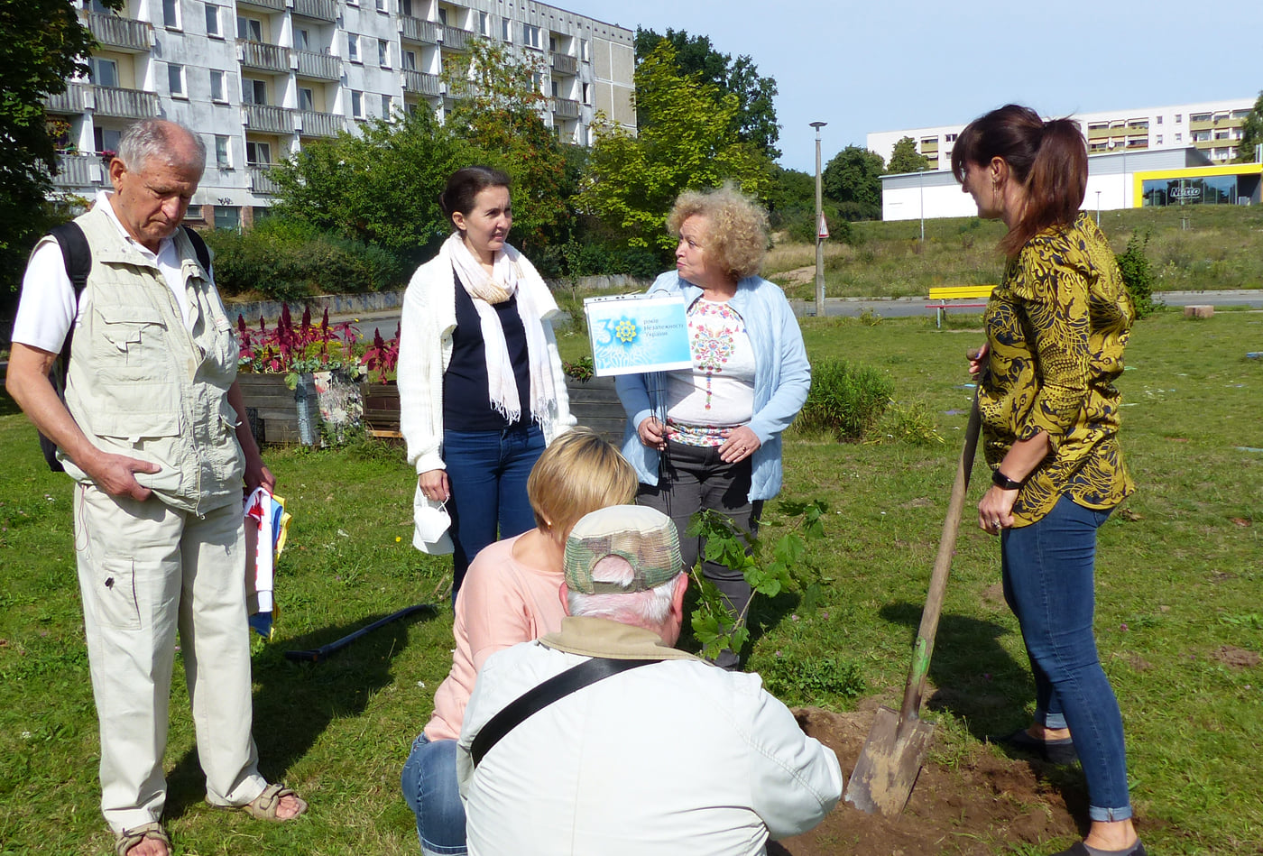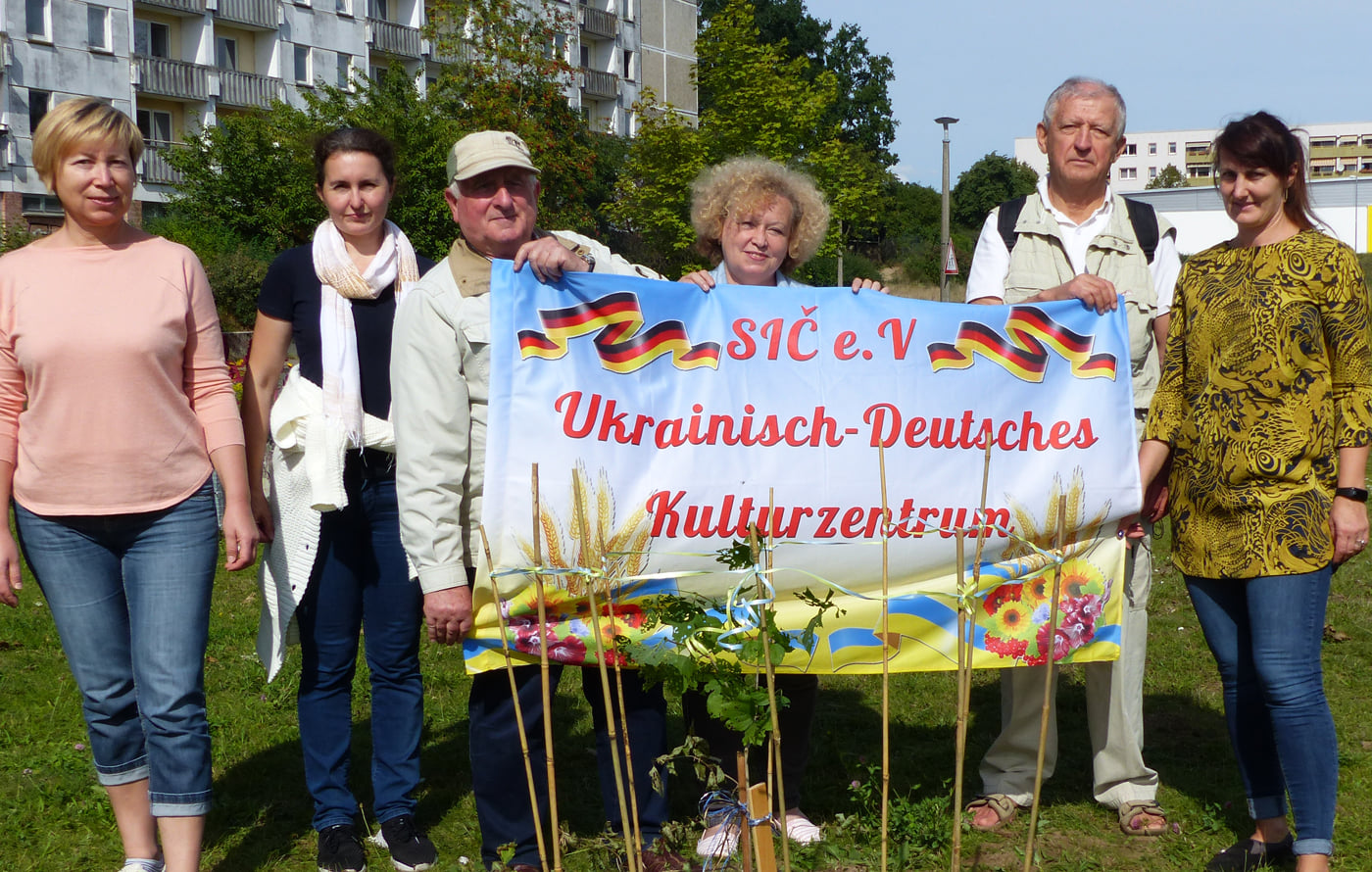 Kalina ist für die Menschen, die aus der Ukraine zu uns gekommen sind, ein Stückchen Heimat. Sie symbolisiert Mutter, Vater und Vaterland. Und so wünschen sich die Mitglieder des Ukrainisch-Deutschen Kulturzentrums, die sie heute gepflanzt haben, dass sie gut gedeihen möge – wie auch die Freundschaft zwischen den Vereinen SIČ und „Die Platte lebt“.