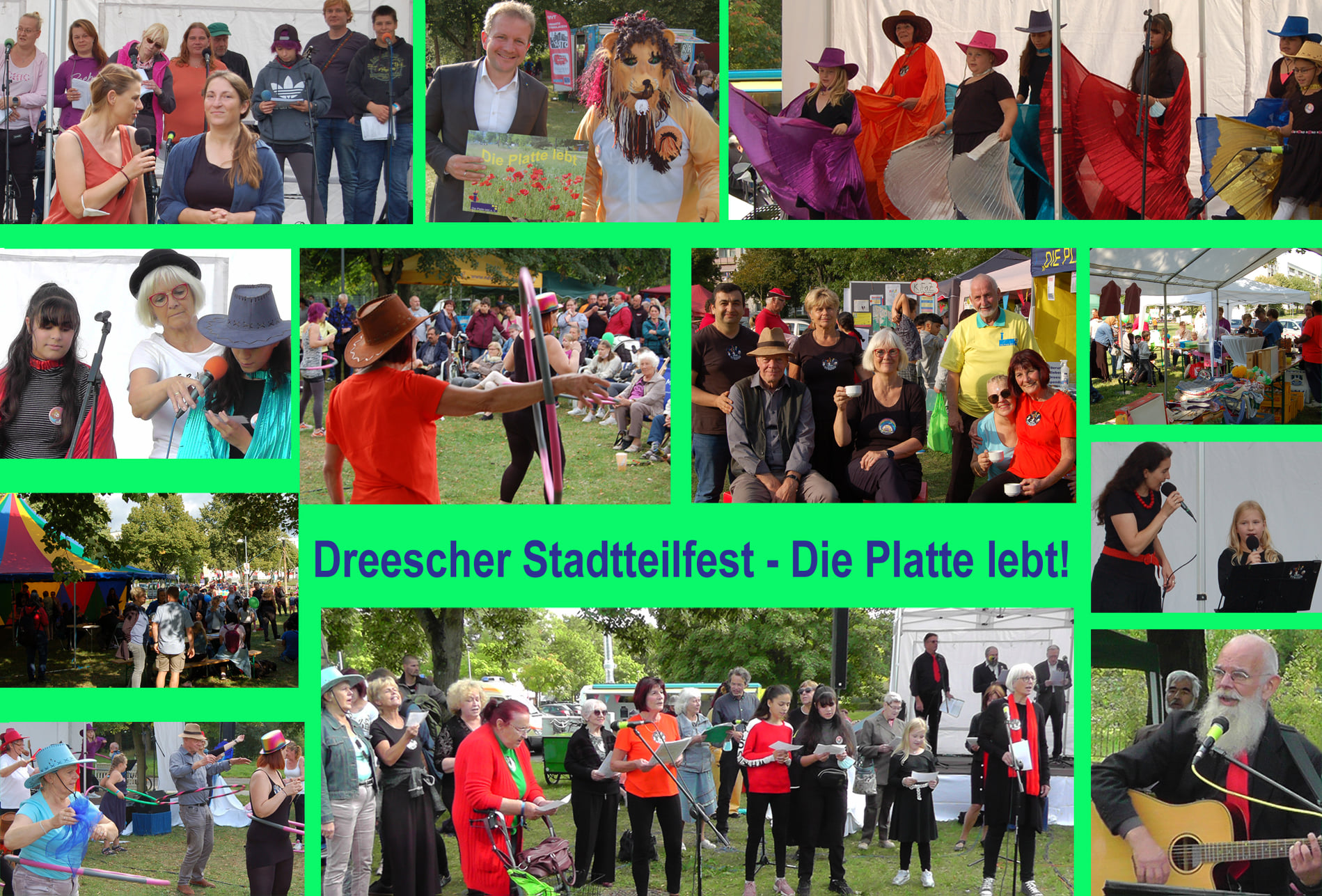 Rückblick auf das Dreescher Stadtteilfest in Bildern. Tolles Wetter, tolle Stimmung, tolle Akteure auf und hinter der Bühne, an den Infoständen und in den Mach-mit-Zelten. Danke den Stadtteilmanagerinnen für die Organisation und danke allen Helfern und Besuchern. Die Platte lebt!