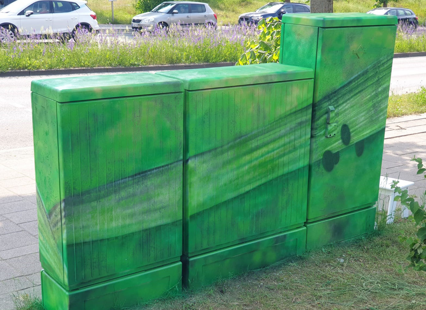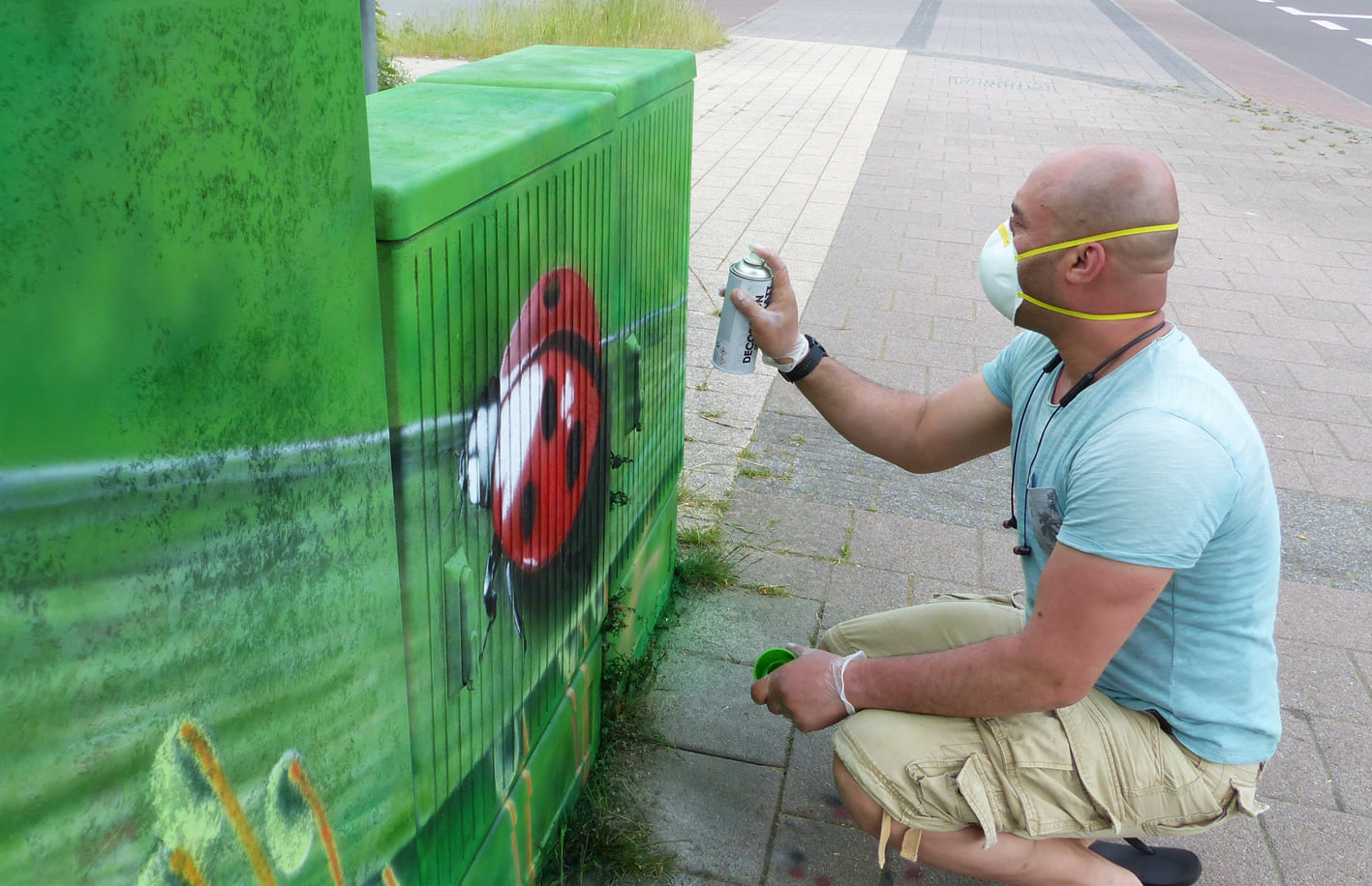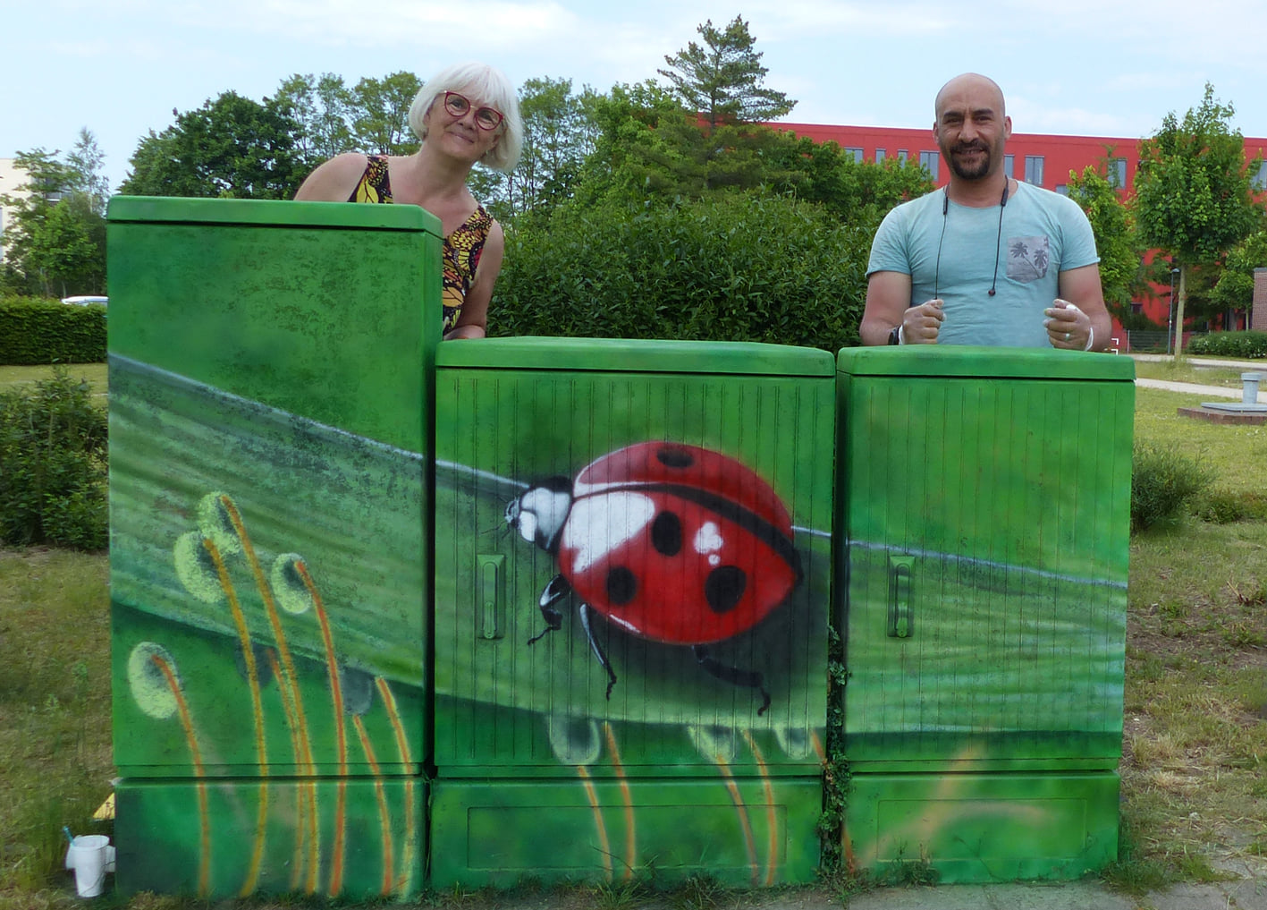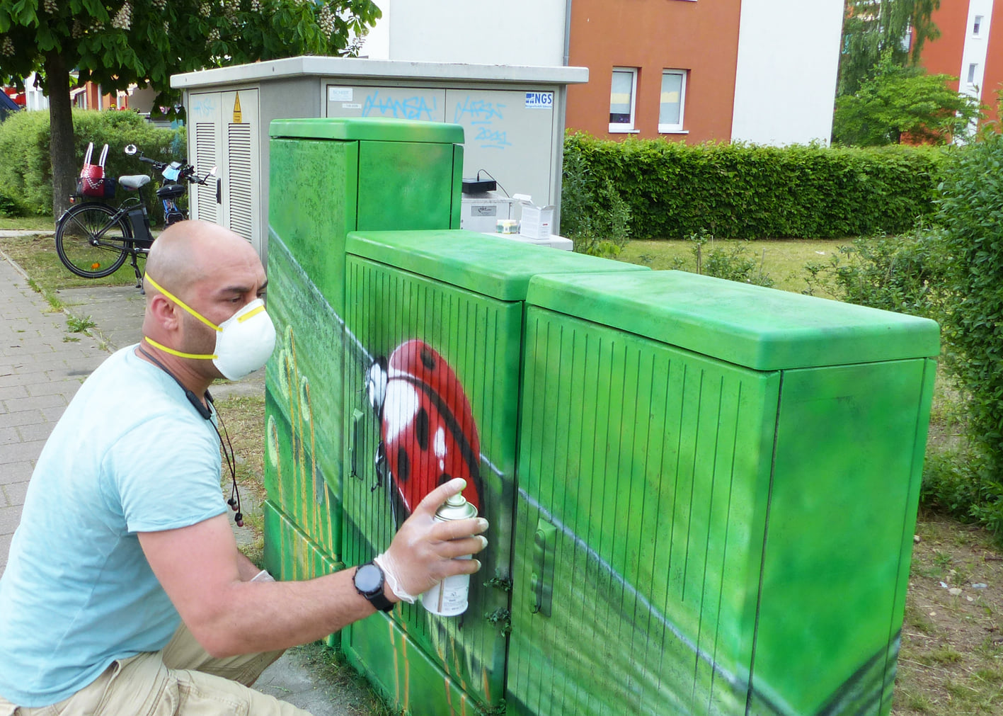 Dies ist der erste von 4 Stromkästen, die von Nasser Masoud gestaltet werden, gefördert aus dem Verfügungsfonds "Soziale Stadt". In die Tallinner Straße ist nun ein Marienkäfer eingezogen. Ich, die Frau fürs Grobe (Reinigung der Kästen vor der Gestaltung), bin schon auf die nächsten Kunstwerke gespannt. Danke, Nasser!